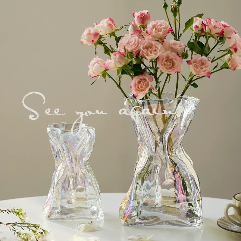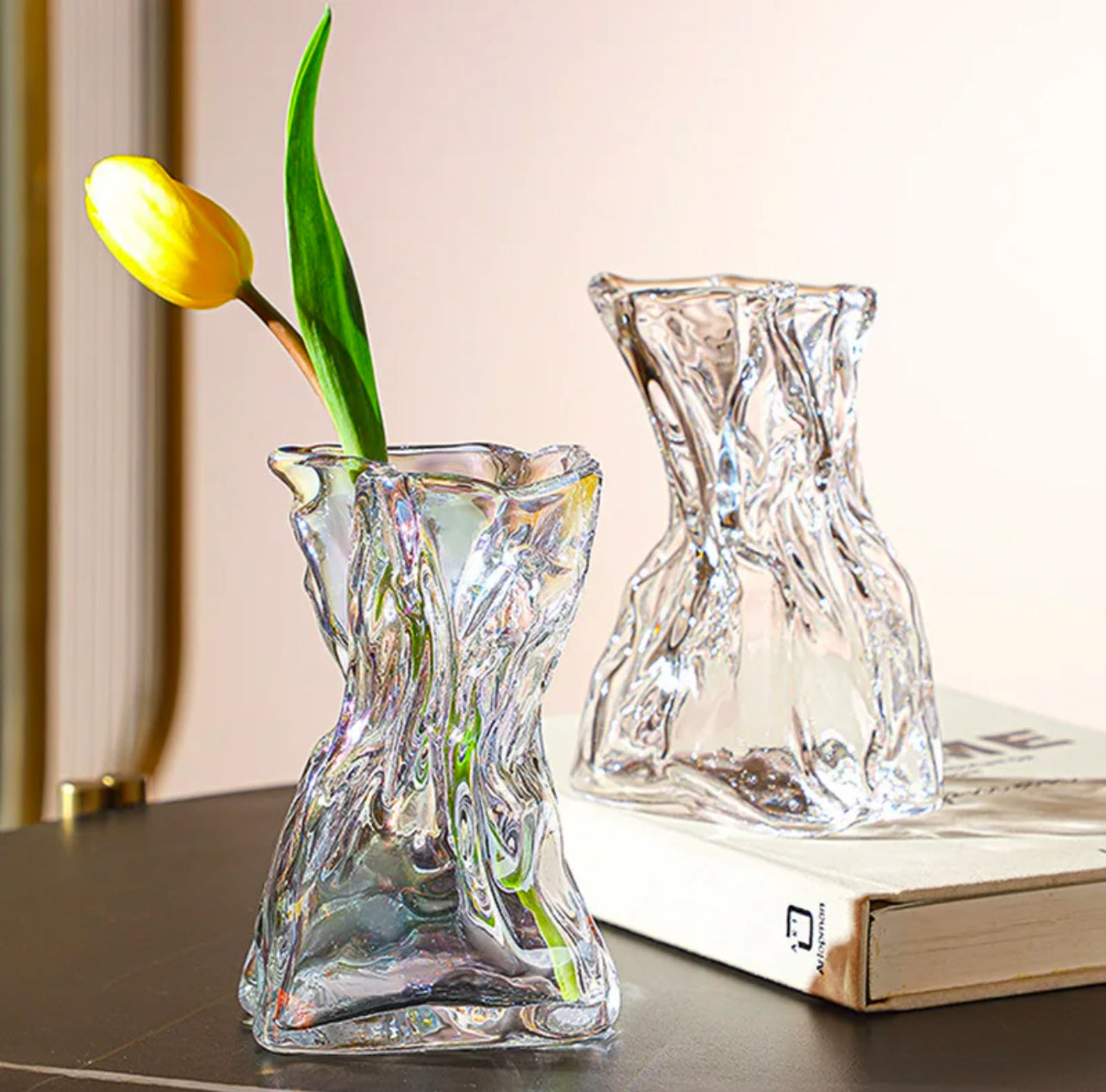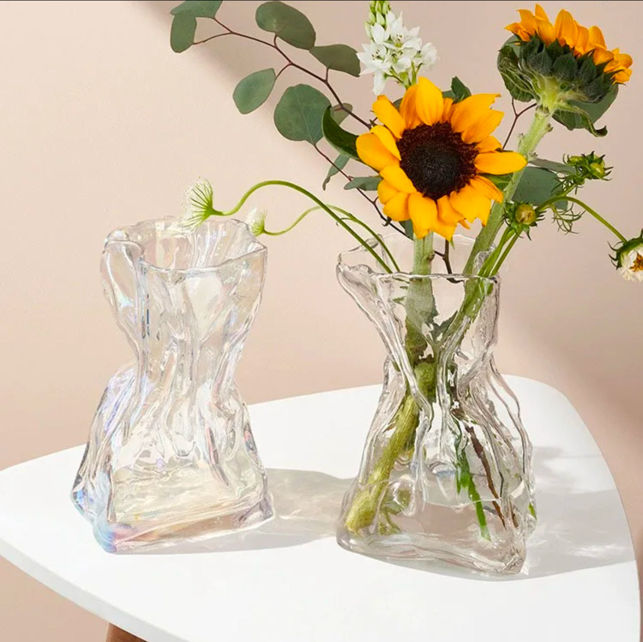 With its distinctive air-filled, rounded shape that produces an eye-catching visual effect, the Air Pouch Glass Vase Set is a contemporary and whimsical spin on traditional vase design. Each vase in this set, which is made of premium glass, exudes a delicate, bubble-like texture that appears to "float" in midair, perfectly encapsulating the spirit of elegance and lightness. These vases' smooth texture and gentle contours make them perfect for modern and minimalist spaces. The Air Pouch Glass Vase Set is ideal for showcasing dried arrangements or fresh flowers, or it may be used as decorative accessories to provide a creative and light touch to any space. Three different-sized vases are included in the set, providing a dramatic focal point and a variety of design options.