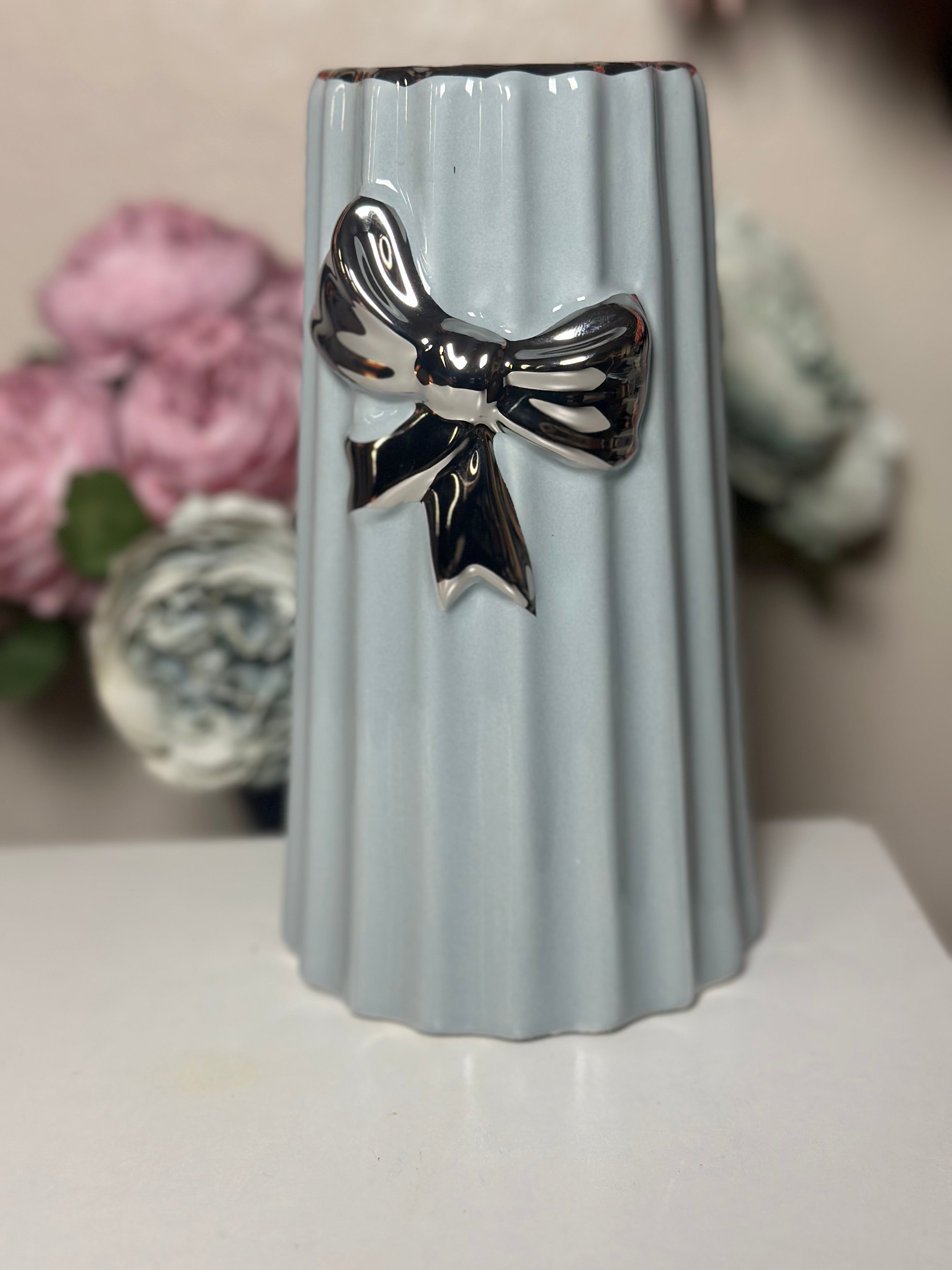 This exquisite Baby Blue Vase embodies sophistication and minimalism, rendering it an ideal embellishment for any environment. Constructed from premium ceramic, it showcases a gentle pastel blue hue that harmonizes with diverse décor styles. The vase features a beautiful silver ribbon wound around its neck, imparting refinement and a subtle shimmer. This vase is perfect for displaying fresh flowers, dried arrangements, or serving as an independent decorative element, imparting a tranquil and elegant atmosphere to your home, office, or event. Its enduring style renders it a considerate gift for every occasion, ranging from housewarmings to celebrations.
