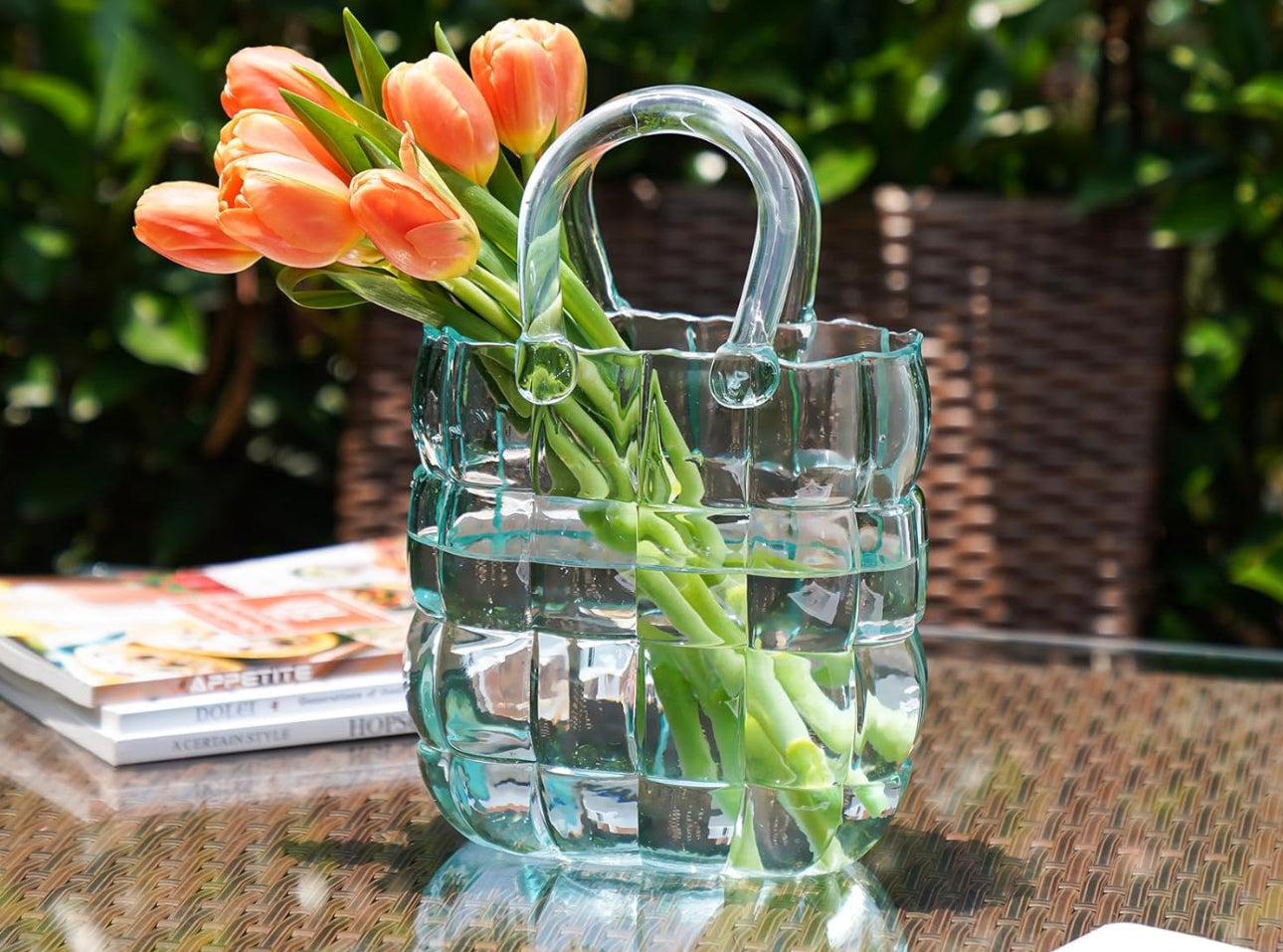 The Elegant Handbag Glass Vase is an elegant and fashionable decorative item that skillfully combines practicality and creative style. This elegant handbag-inspired vase is made of premium glass and has elaborate craftsmanship that resembles the timeless characteristics of a high-end item. It looks futuristic and elegant thanks to its clear glass body, which is ideal for displaying colorful floral arrangements or standing alone as a statement piece. This vase is perfect for adding flair to any living area because it blends sophistication and whimsy, making it an essential item for anyone who values stylish and distinctive home décor.