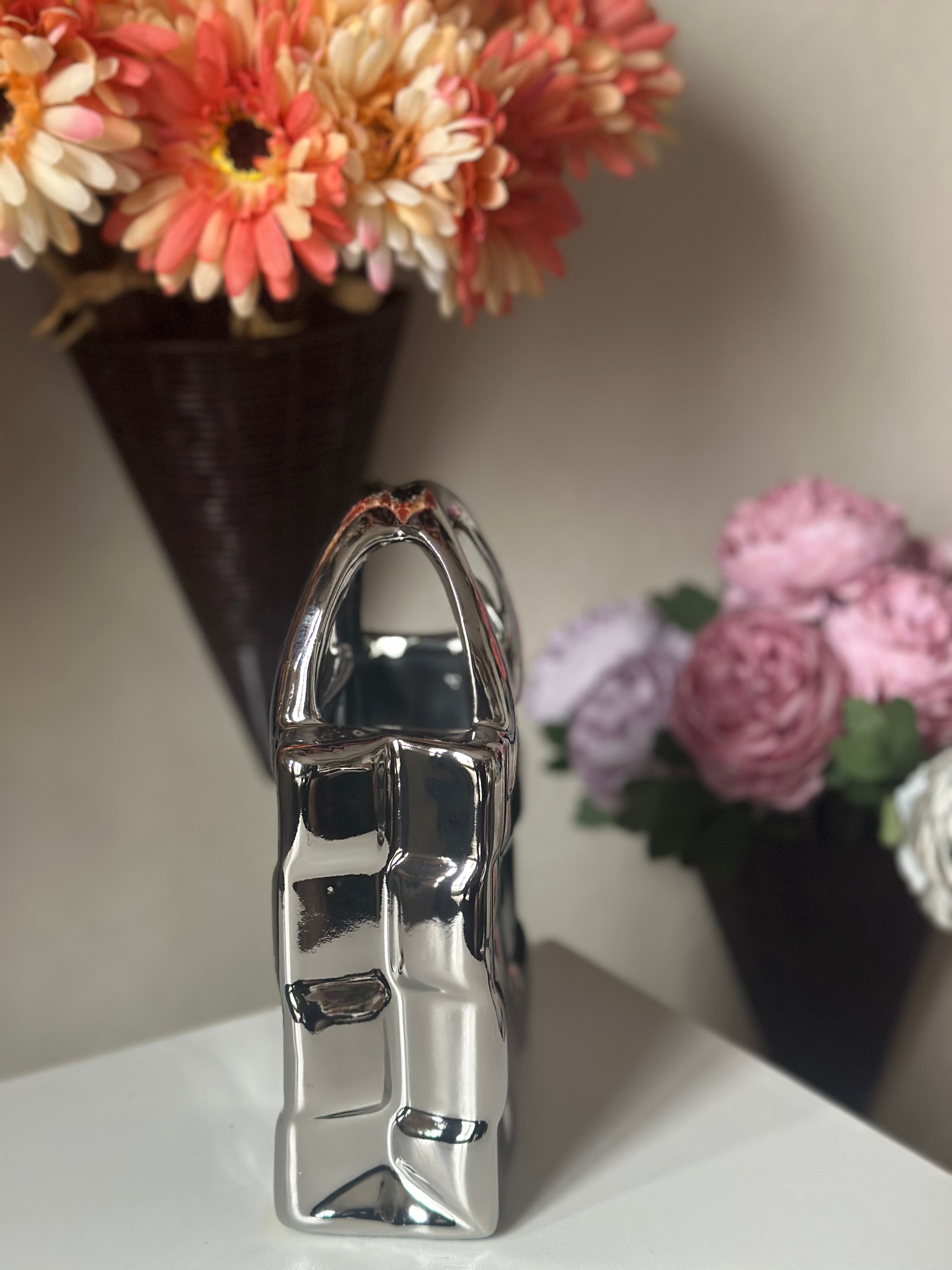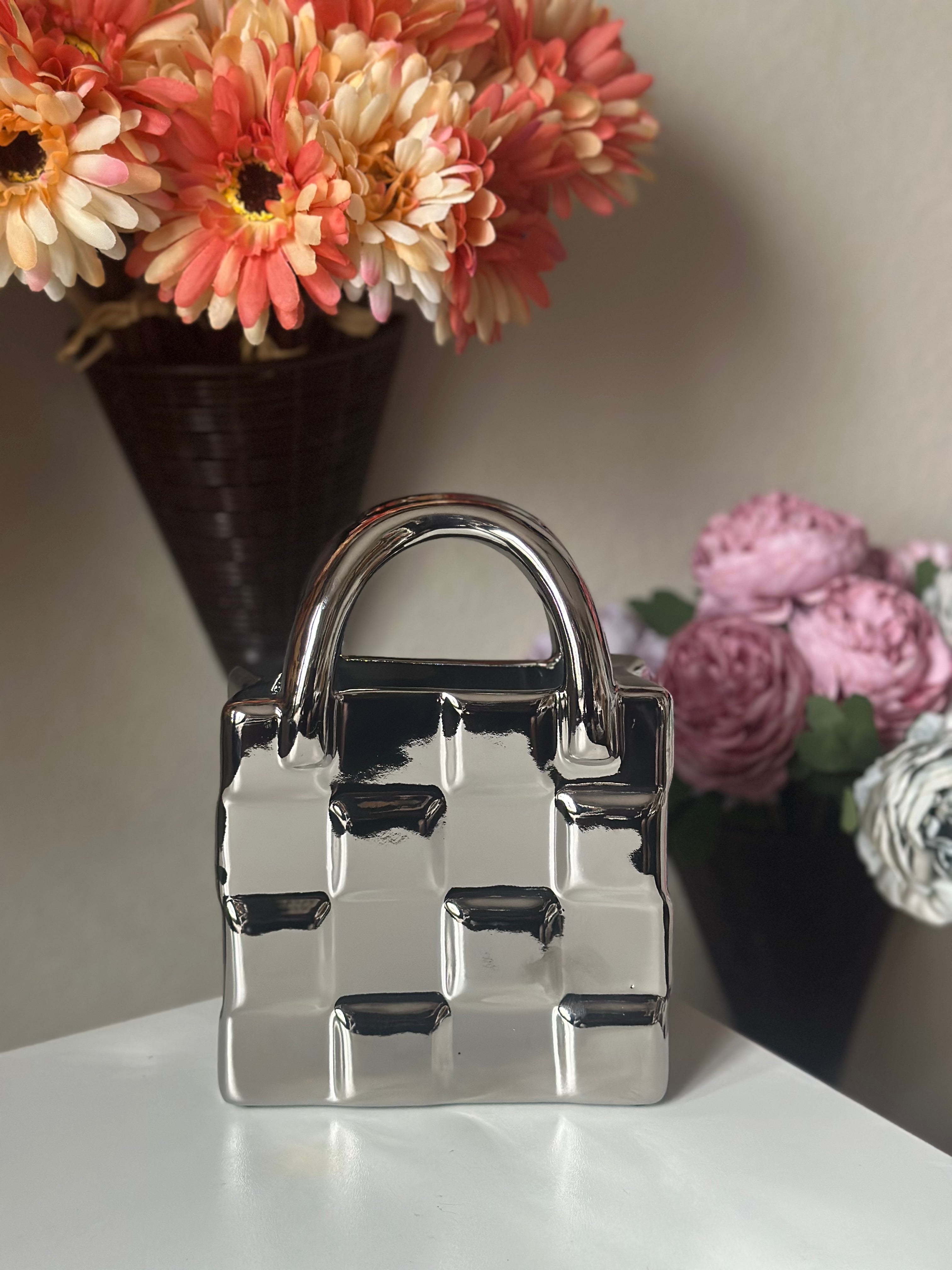 Enhance your décor with the distinctive Chrome Handbag Ceramic Vase, a remarkable fusion of sophistication and contemporary design. This vase, designed in the form of an elegant purse, boasts a lustrous chrome finish that imparts an element of opulence and refinement to any environment. Its audacious design renders it a striking focal point, ideal for showcasing flowers, foliage, or serving as an independent decorative element. The Chrome Handbag Ceramic Vase seamlessly integrates functionality and aesthetics, suitable for placement in a living room, office, or as a discussion piece in an entryway. Its unique form and reflective exterior render it an ideal present for trendsetters and décor aficionados.
